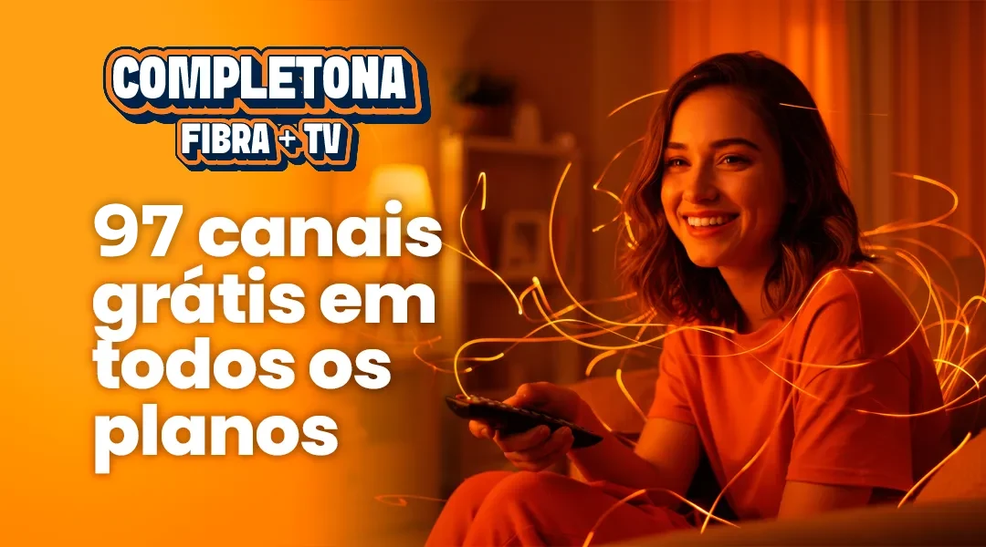 * REGULAMENTO DA PROMOÇÃO COMPLETONA FIBRA E TV: A velocidade contratada depende da compatibilidade dos equipamentos do usuário. Plano sujeito à análise de crédito e fidelidade de 12 meses, com multa proporcional em caso de cancelamento. Oferta relativa ao Plano de 650 Mega. Valor de R$ 89,90 nos 3 primeiros meses e R$ 99,90 a partir do 4º mês. Oferta relativa ao Plano de 800 Mega. Valor de R$ 99,90 nos 3 primeiros meses e R$ 109,90 a partir do 4º mês. Oferta relativa ao Plano de 1 Giga. Valor de R$ 139,90 nos 3 primeiros meses e R$ 149,90 a partir do 4º mês. Preço válido para pagamentos realizados até a data de vencimento. Para os demais planos e pacotes, consulte condições.